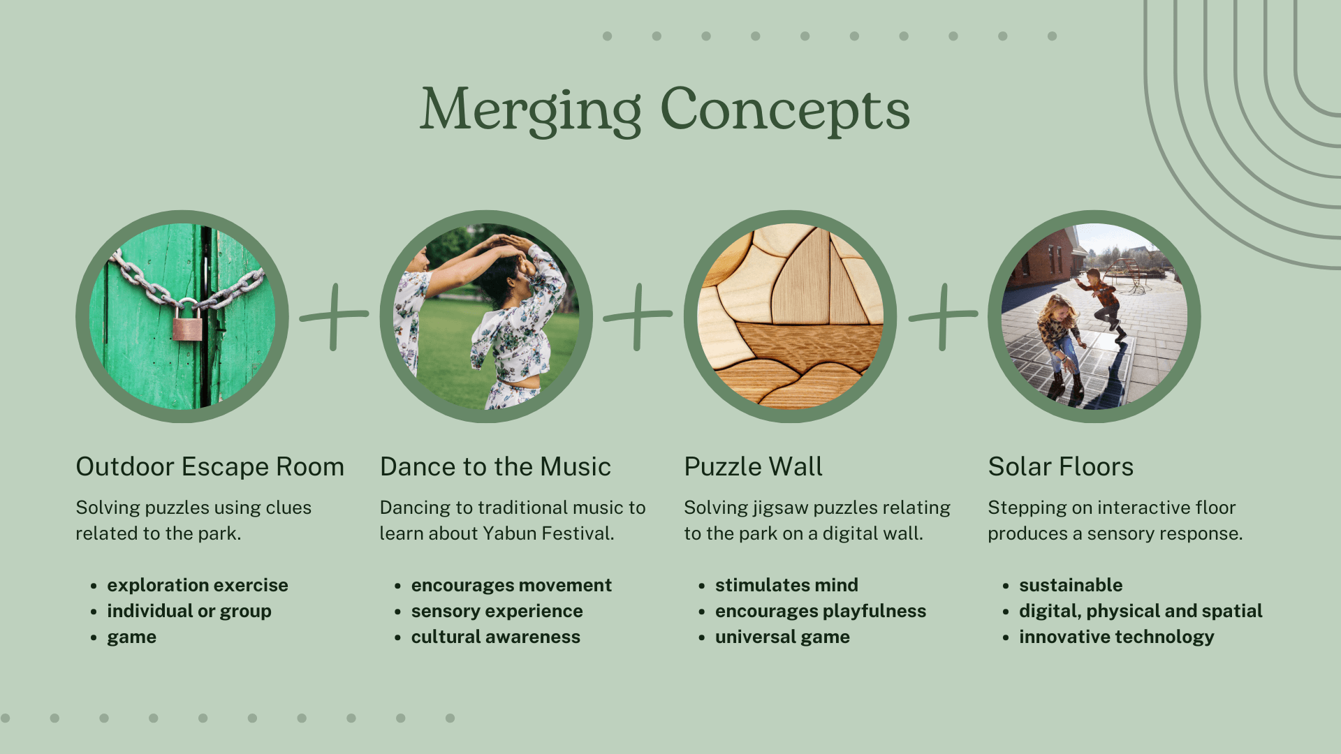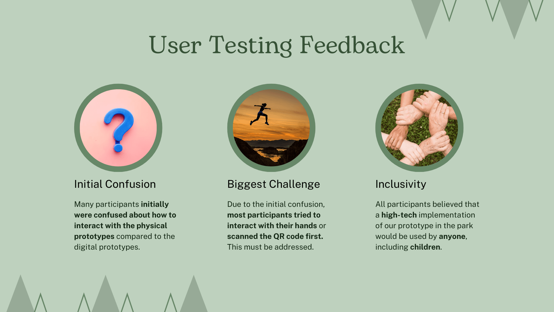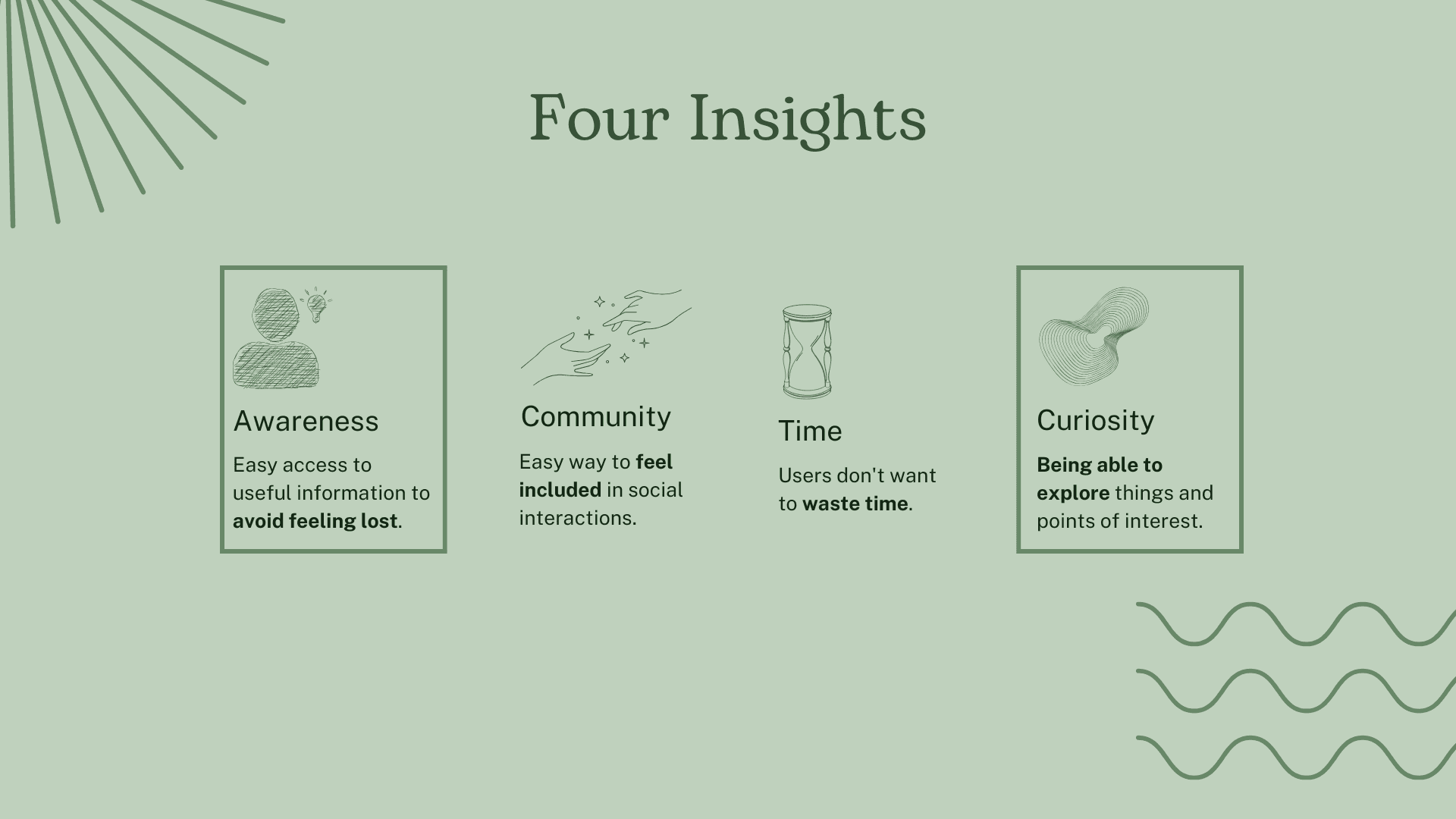 Our insights surrounded awareness, community, time and curiosity. However, for our refined design problem, we prioritised two - a need for awareness of the park's offerings and curiosity to engage in playful, inclusive experiences.