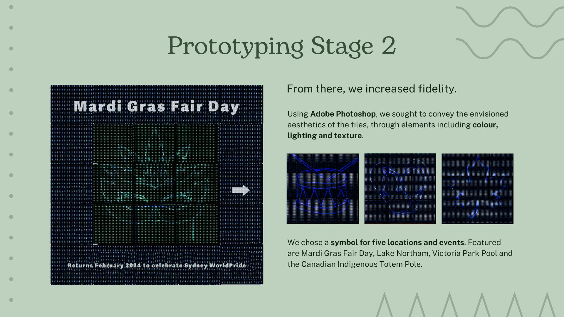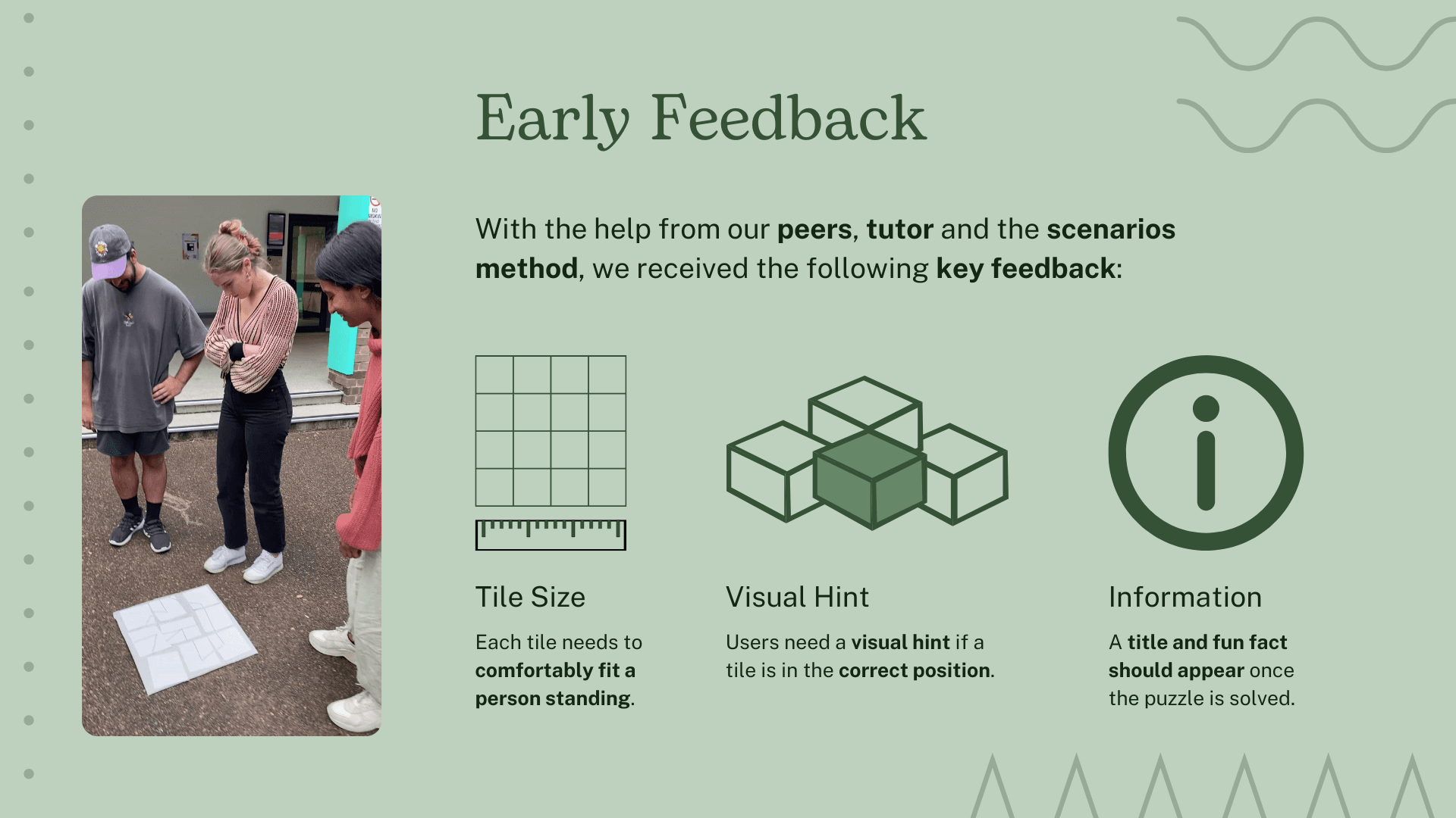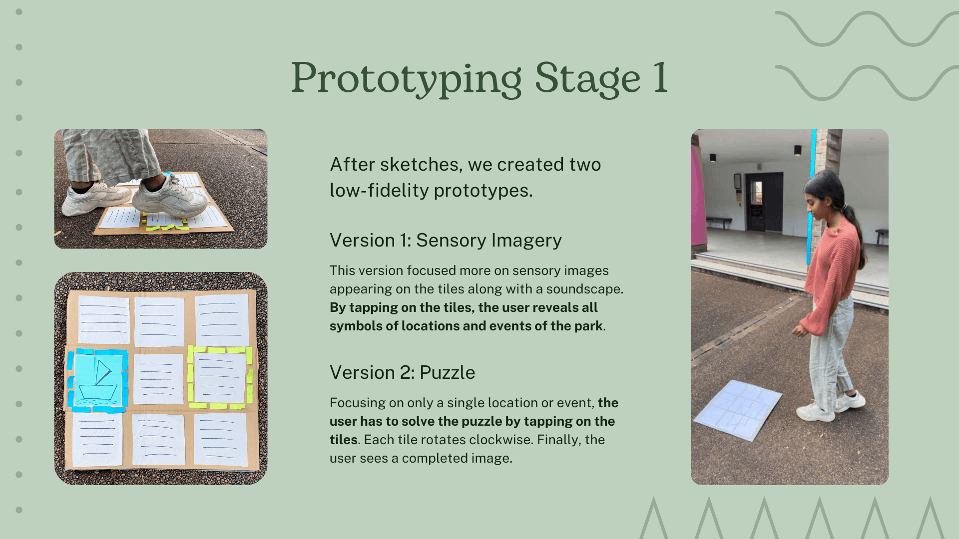 We decided to build upon 'Version 2' of our concept for our final prototype - puzzle tiles on the ground rotate clockwise when stepped on, until they turn green when they are in the correct position. When the user sees the completed image, which is related to one of the five main offerings of Victoria Park, a fun fact appears.