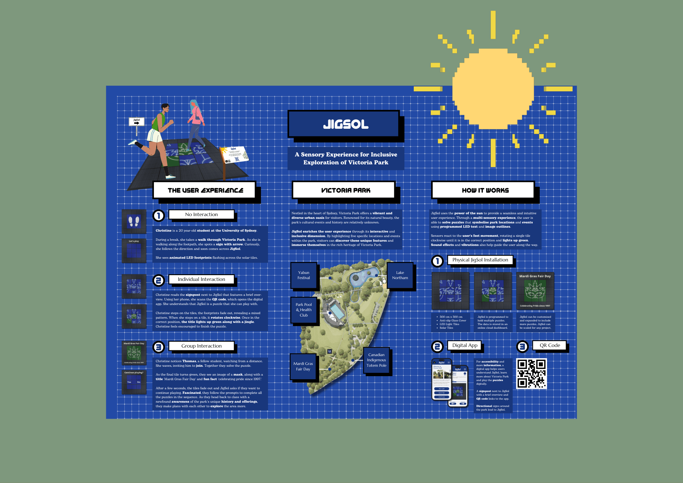 JigSol is a sensory experience for inclusive exploration of Victoria Park. It enriches the user experience through its interactive dimension. By highlighting five specific locations and events within the park through LED puzzle tiles, visitors can discover these unique features and immerse themselves in the rich heritage of Victoria Park.