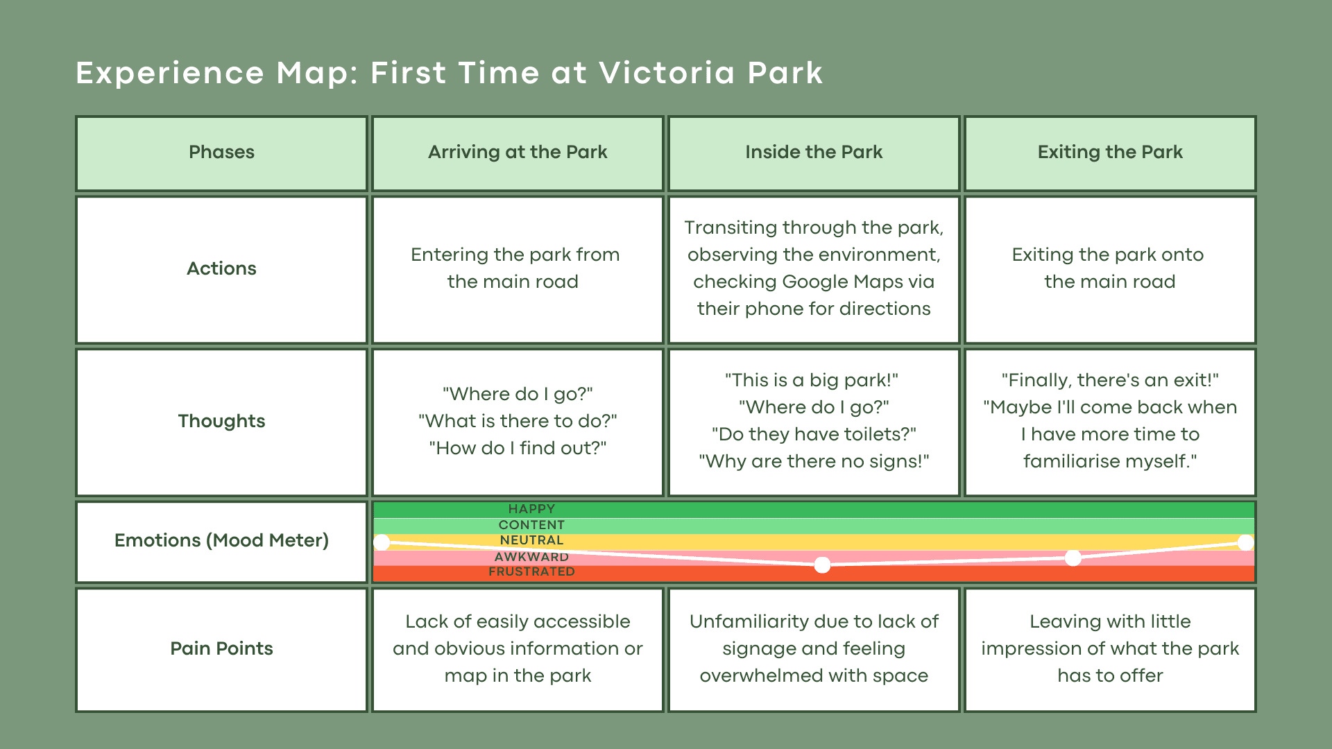 From our research insights, our refined design statement was to design an inclusive experience to help facilitate awareness of Victoria Park's offerings and inspire curiosity in young adults.