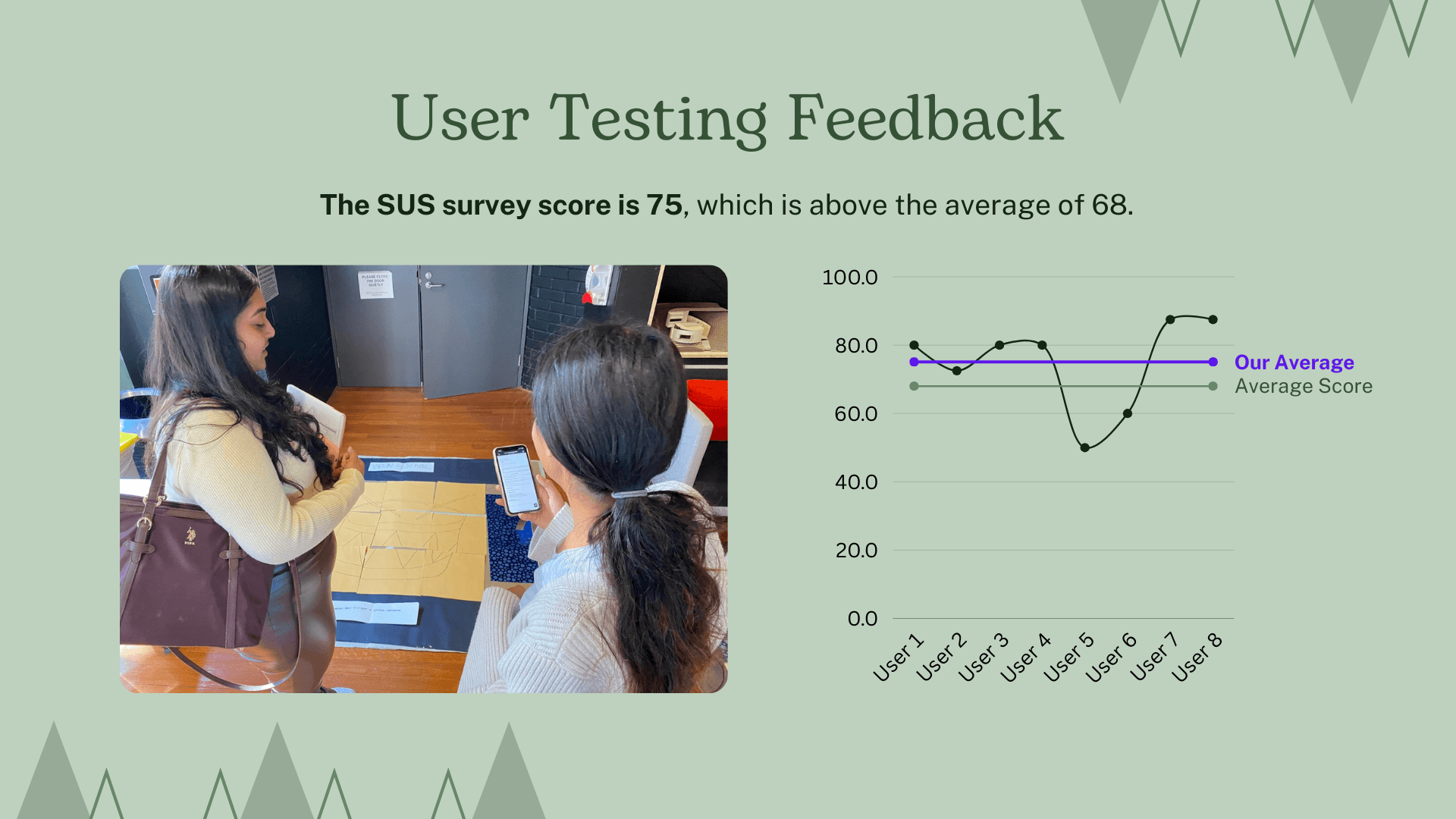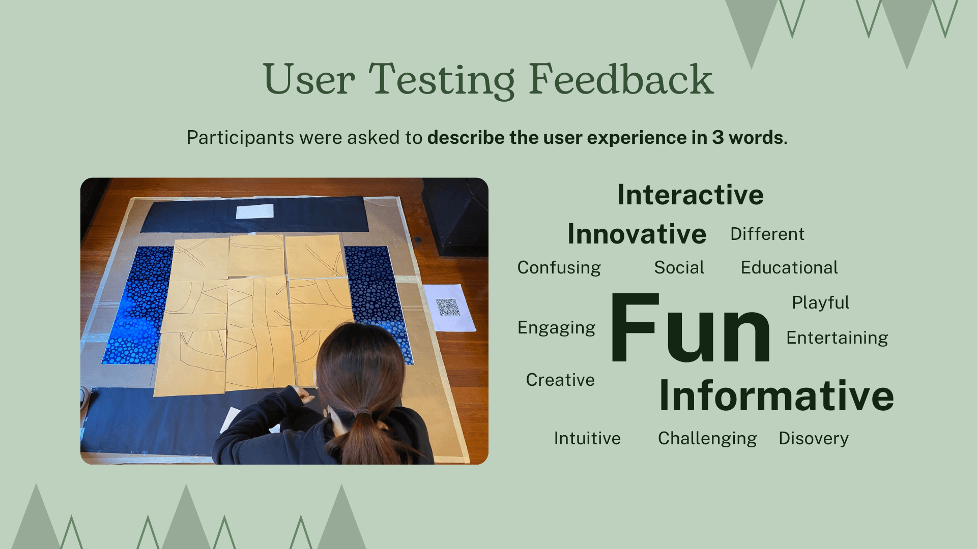 Testing was conducted with users using the physical cardboard prototype, followed by verbal feedback and an SUS survey. Our aim was to see how participants would intuitively interact with the prototype. With the puzzle tiles being jumbled, many were confused and tried to interact with their hands. This influenced us to add a visual stimulus of 'stepping feet', as well as an instructional sign for our final prototype.