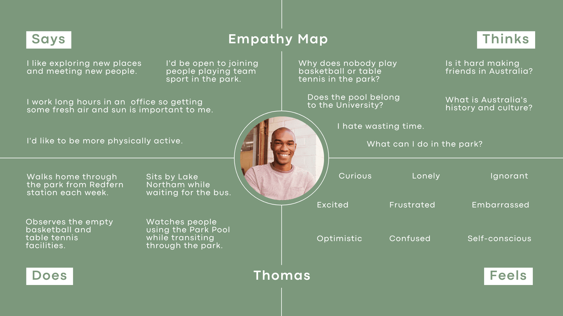 Below are examples of our analysis and synthesis. Our main takeaways from our questionnaires surrounded the lack of knowledge and interaction with the park's community and offerings, both individually and socially. These insights were further emphasised by our observations of most visitors using the park as a transit hub. Our main takeaways from interviews highlighted the importance of feeling included and engaged in social experiences, the value of time and convenience, and the need for more easily accessible information.